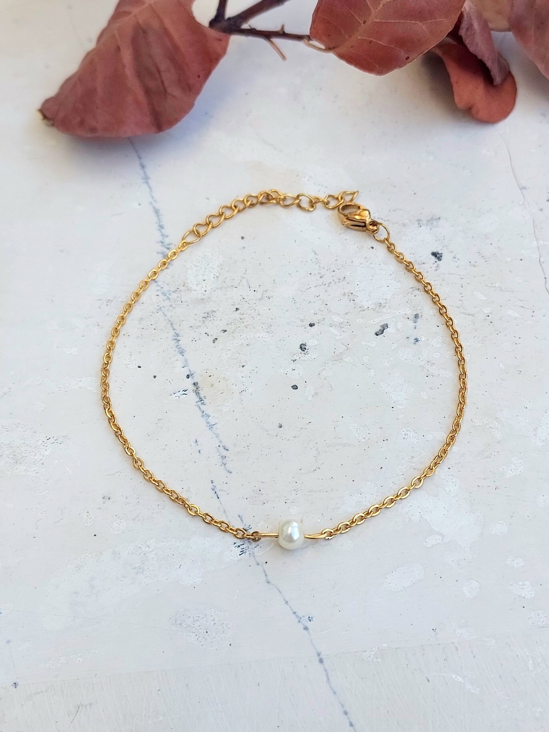 Χειροποίητο, χρυσό, ατσάλινο βραχιόλι με πέρλα.
