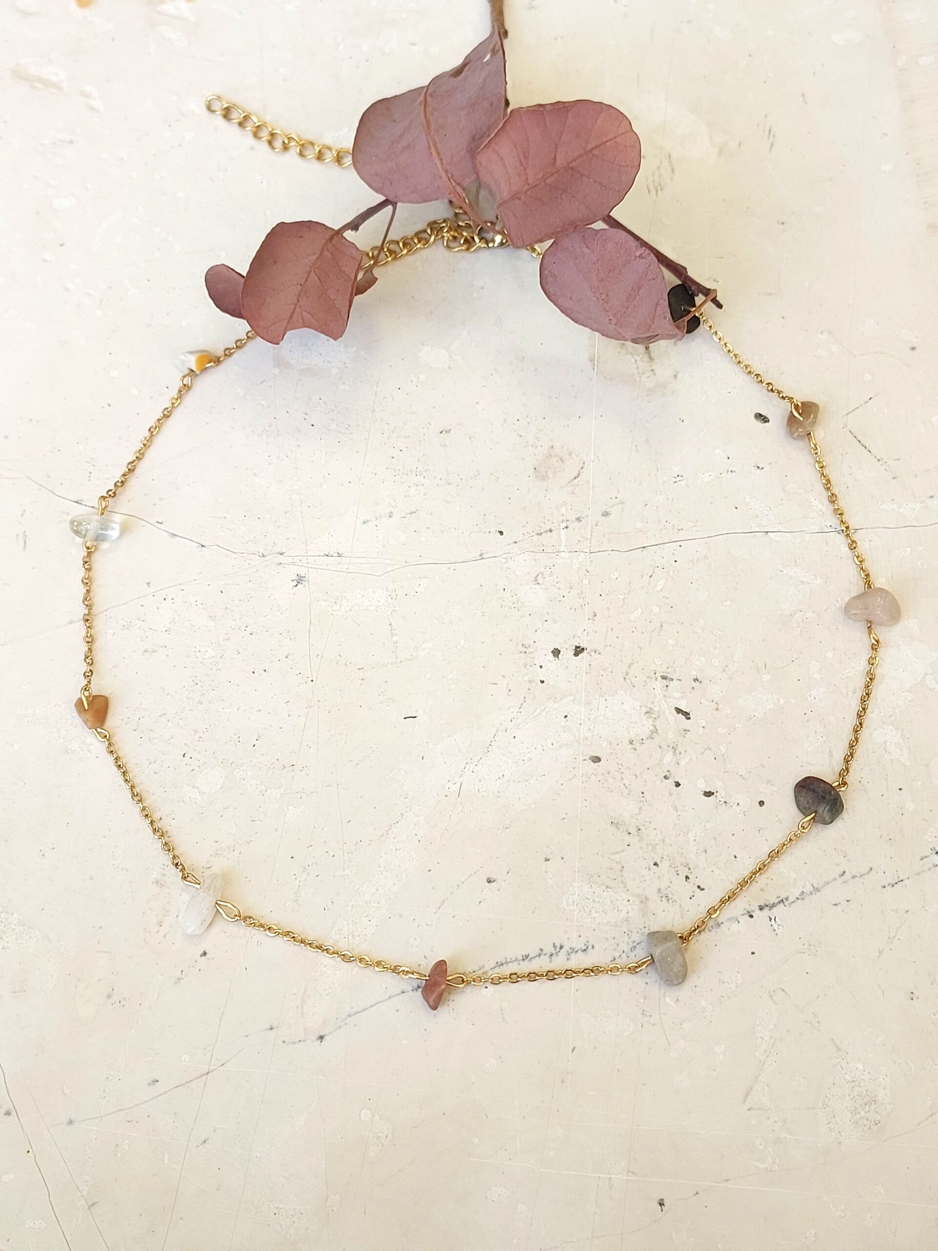 Χειροποίητο ατσάλινο κολιέ με τσιπς σε γήινες αποχρώσεις.