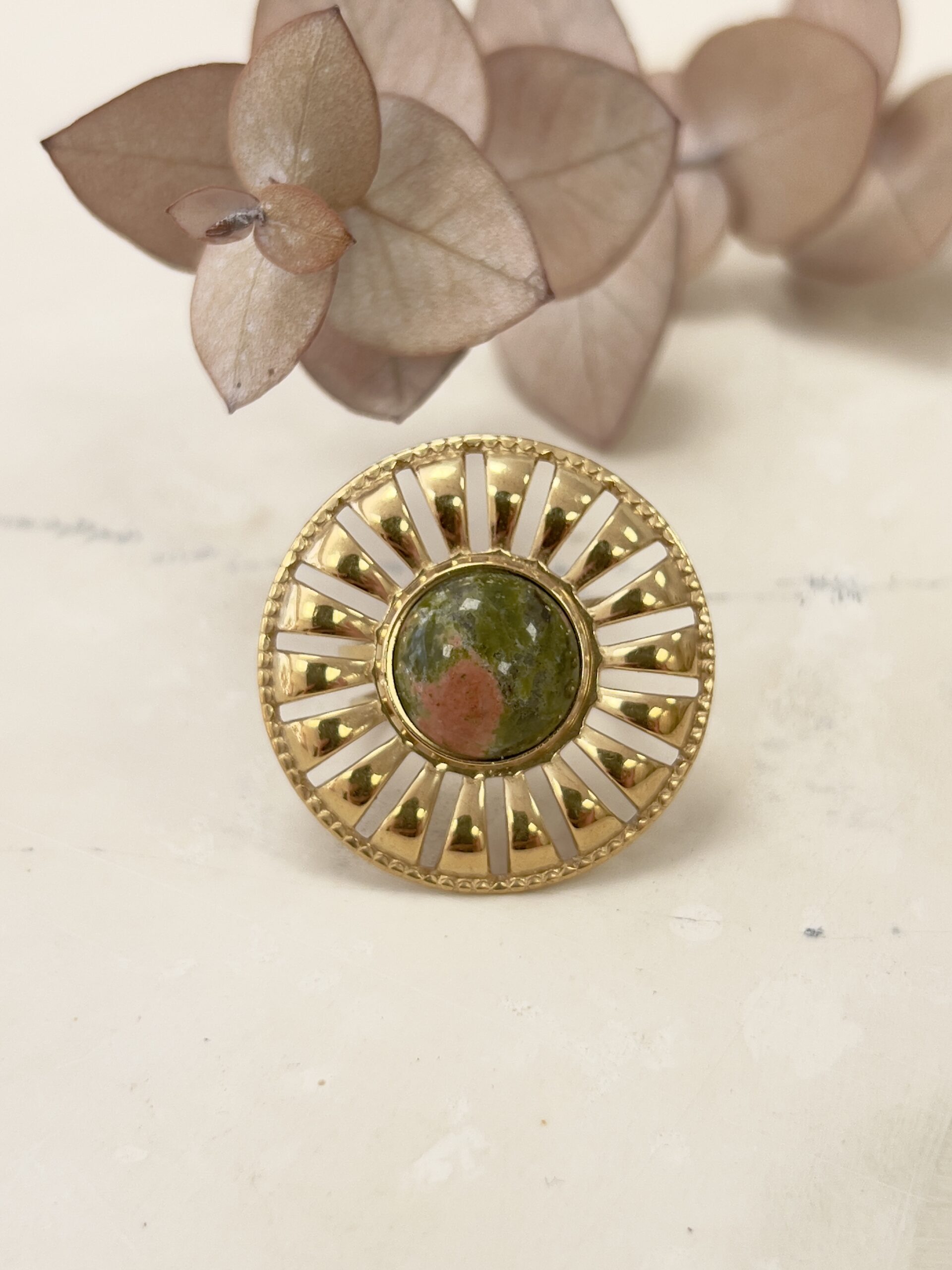 Χρυσό ατσάλινο δαχτυλίδι με πράσινη πέτρα.