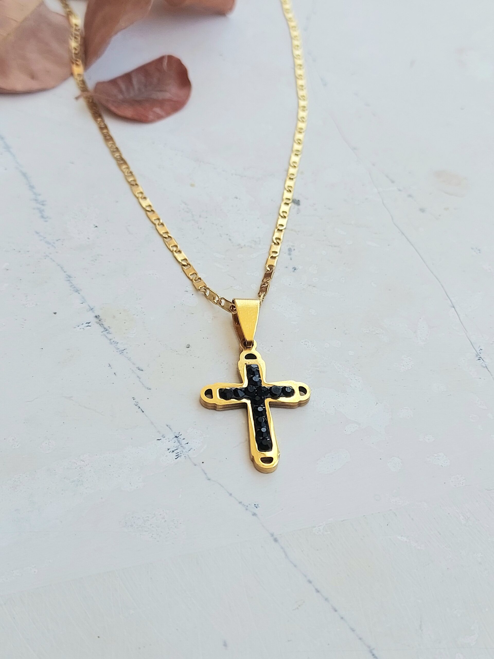 Χειροποίητο, χρυσό ατσάλινο κολιέ με σταυρό με σμάλτο και μαύρα στρας.